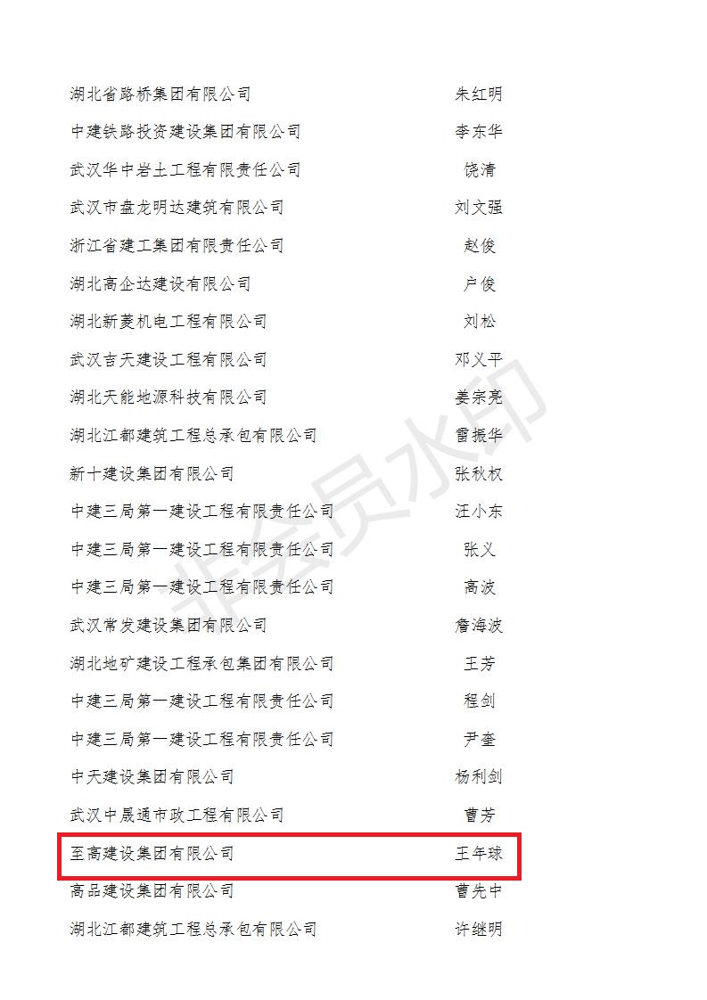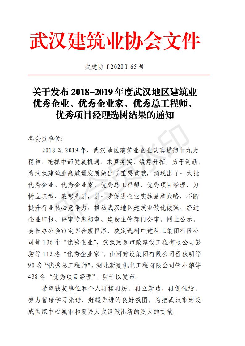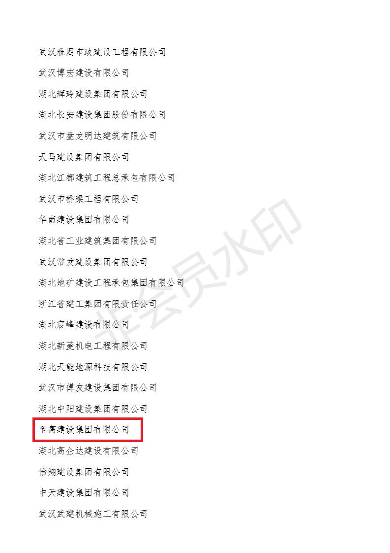 2020年10月21日,武漢市建筑業(yè)協(xié)會發(fā)文,至高建設(shè)集團(tuán)喜獲“2018-2019年度武漢地區(qū)建筑業(yè)優(yōu)秀企業(yè)和2019年武漢市最具成長性民營企業(yè),這是繼去年獲評2018年武漢市最具成長性民營企業(yè)后,至高再次獲獎。集團(tuán)公司董事長王松球榮獲優(yōu)秀企業(yè)家獎,集團(tuán)總工程師王年球榮獲優(yōu)秀總工程師獎,集團(tuán)公司六位職工李寧、邱常菊、錢勇、周攀、蔡威、陳建文榮獲優(yōu)秀項(xiàng)目經(jīng)理獎。